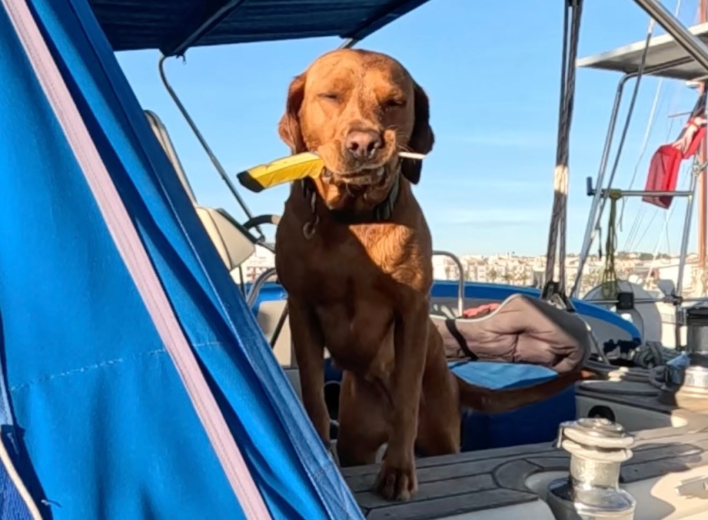 We spent a lot of time polishing the hull. The water reflections are sparkling off it. Notice the tailplane carrying the solar panels and our Starlink antenna. We are pretty much self sufficient as long as its not winter. The blue shapes at the front contain our fenders.