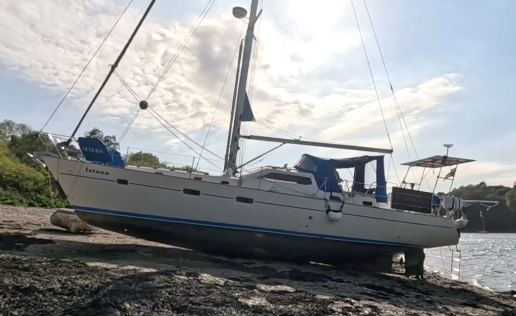 People passing by, rather surprised say ‘Did you mean to do that?’. Yes, we did, but it actually takes some careful planning, not least so we can get back in the water again with the tide.